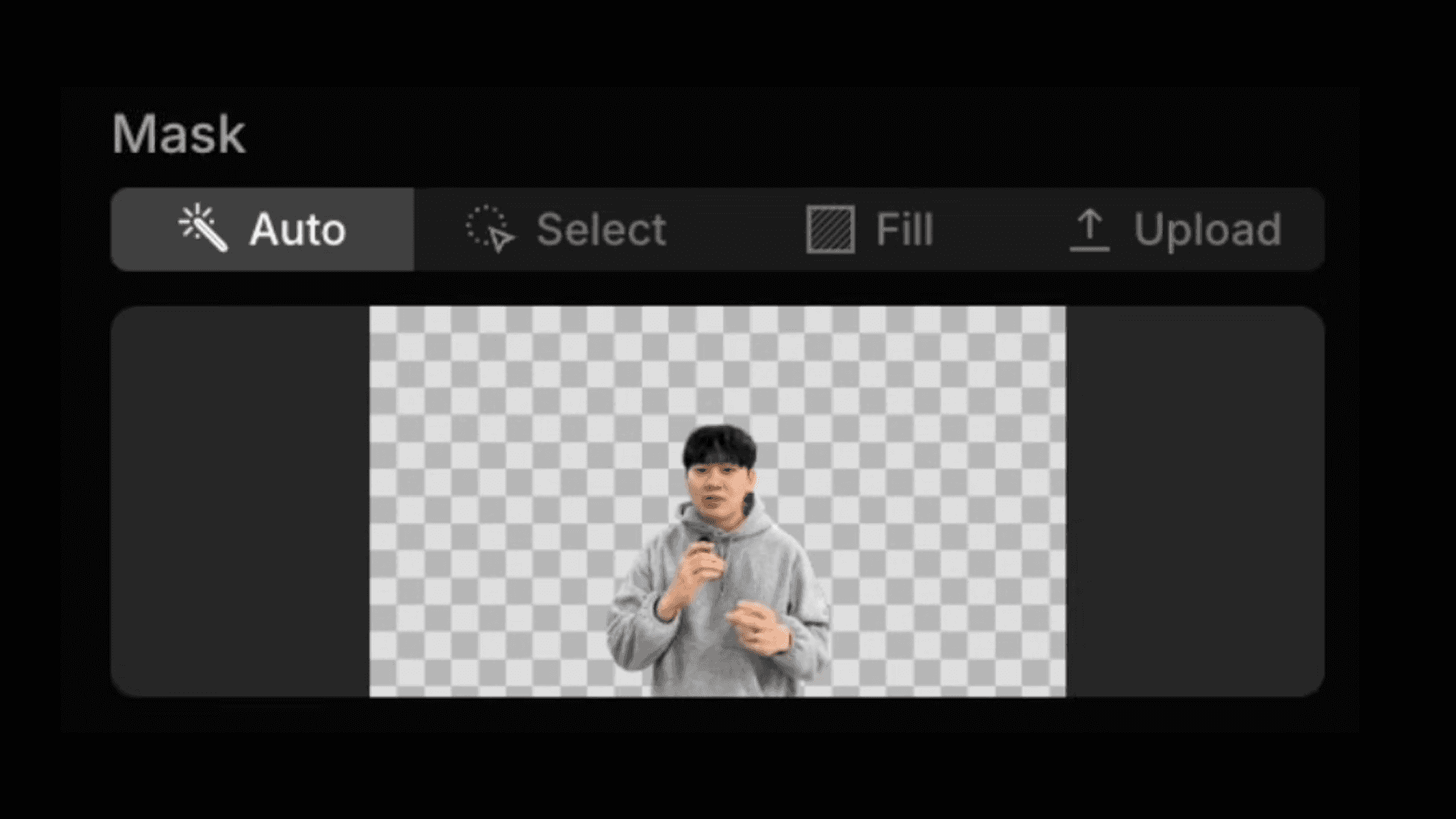 For full production control, Upload mode lets you bring your own black-and-white alpha map video, exported from tools like Nuke or Adobe After Effects.